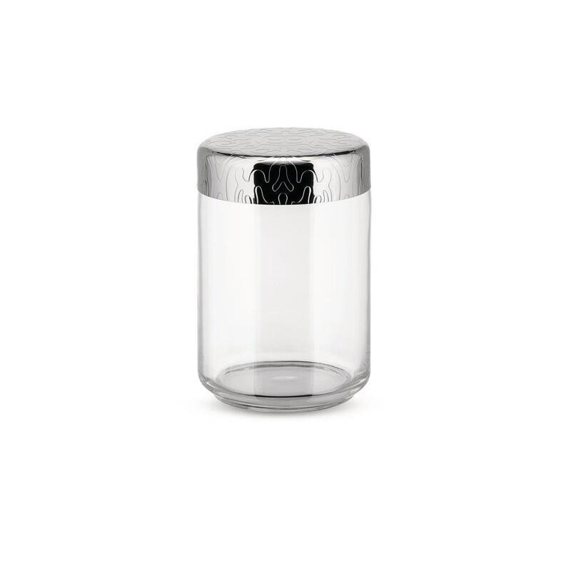 Barattolo in vetro. Coperchio in acciaio inossidabile 18/10 con campanella e decoro a rilievo.