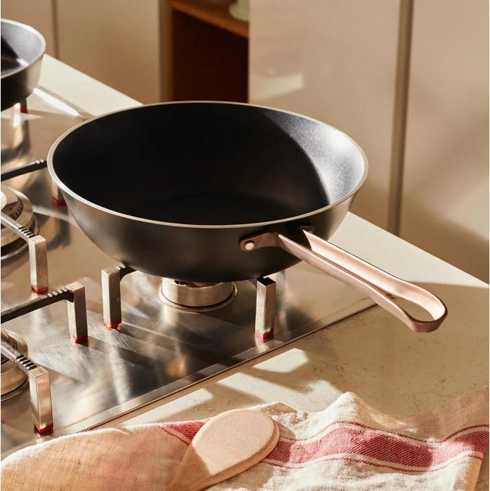 Il manico allungato, i bordi alti e il corpo concavo, rendono questa padella ideale per saltare le