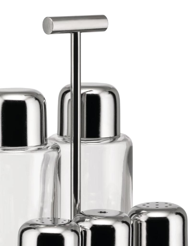 Servizio per olio, aceto, sale, pepe e spezie in acciaio inossidabile 18/10 e vetro.