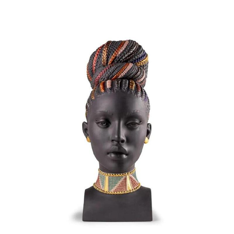 Busto elaborato in porcellana nera decorata con colori vivaci in omaggio alla bellezza africana
