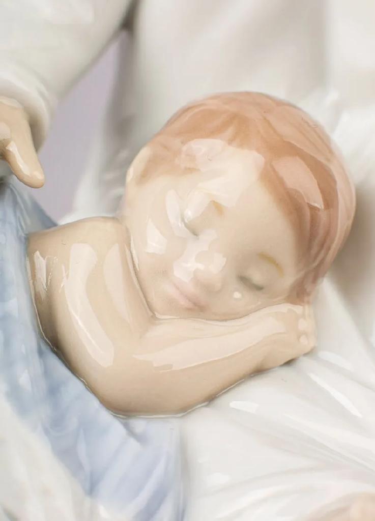 Scultura di porcellana scintillio di un angelo che copre un bambino con una coperta rosa