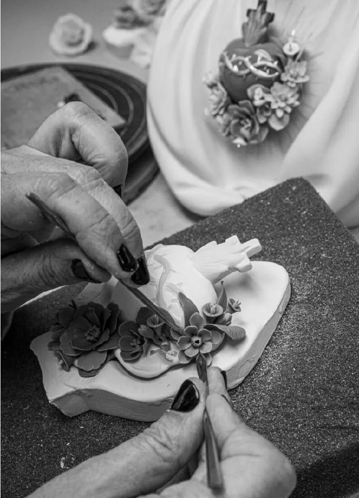 Rappresentazione del Sacro Cuore di Gesalizzata in porcellana bianca con brillanti dorati e una ricca decorazione floreale