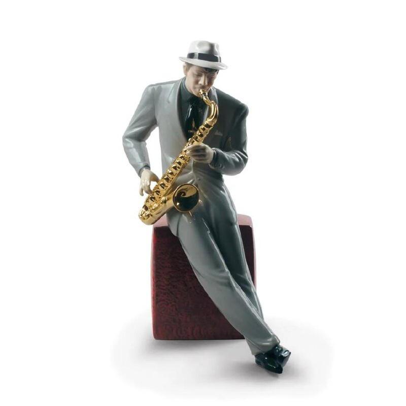 Il sassofonista jazz in abito elegante per la performance è una scultura in porcellana originale sia