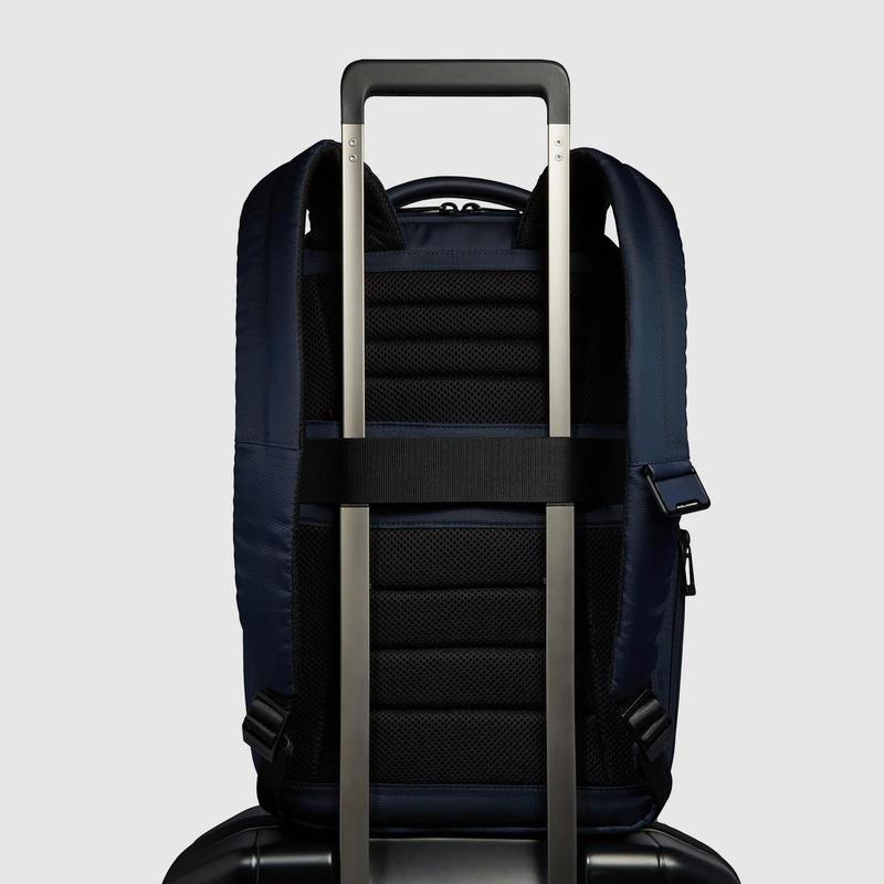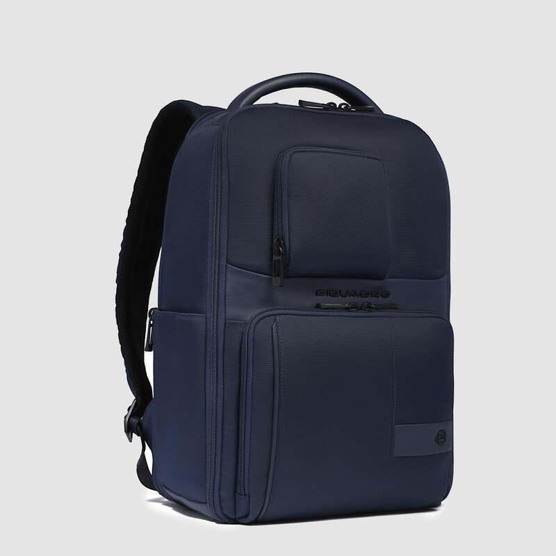 Zaino da viaggio porta pc e iPad in pelle e tessuto con tasche per AirPods, botttiglia e Piquadro Smart Tracker, protezioni antiurto e RFID