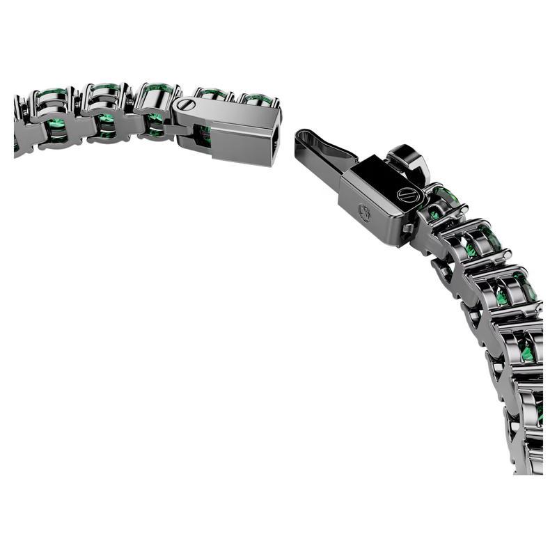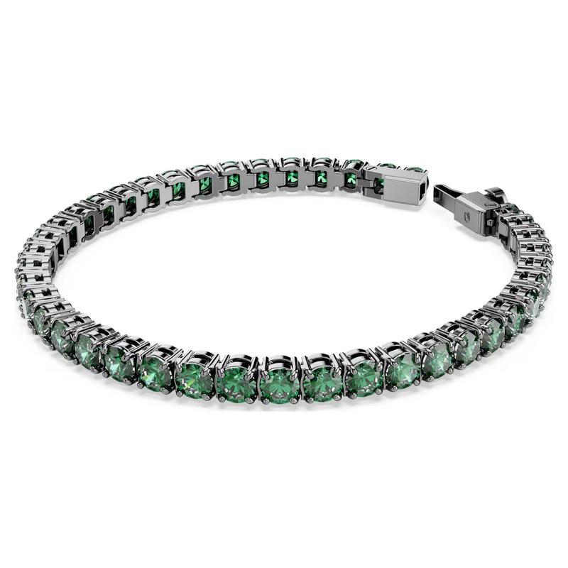 Swarovski Zirconia verdi e placcatura in rutenio dal tono freddo. Una fila uniforme che cattura