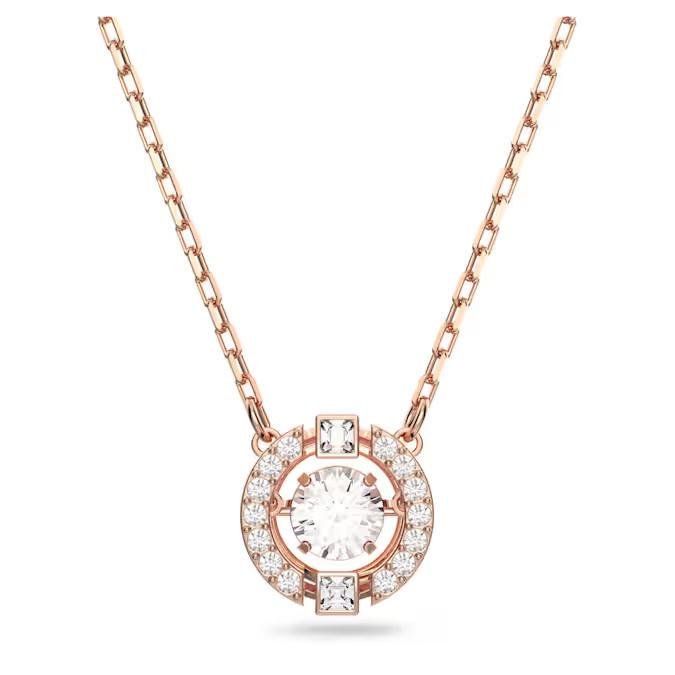 La collana placcata oro rosa interpreta l’idea del cristallo “danzante”, qui proposto in un taglio
