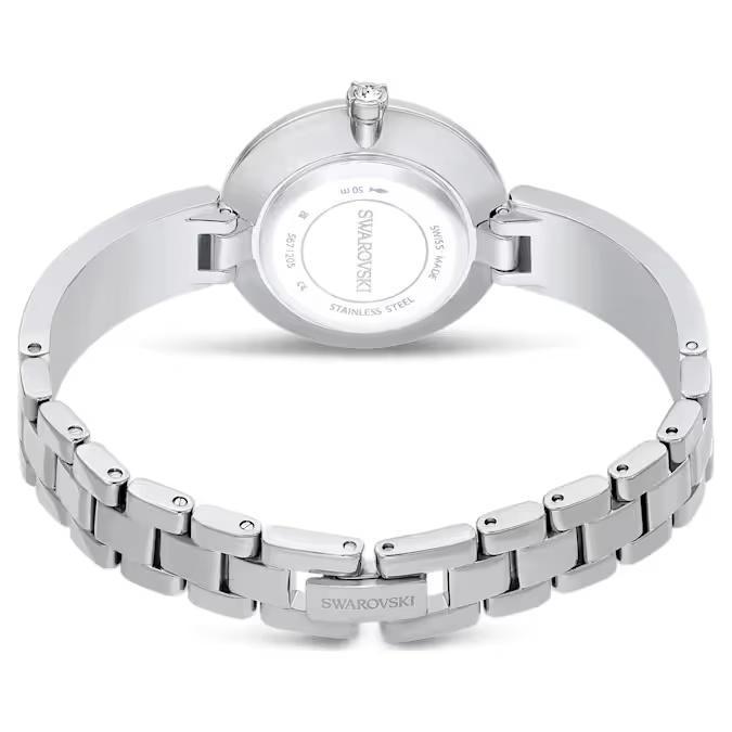 sunray presenta un logo cigno posizionato alle ore 12 e tre cristalli quadrati che formano gli indici.