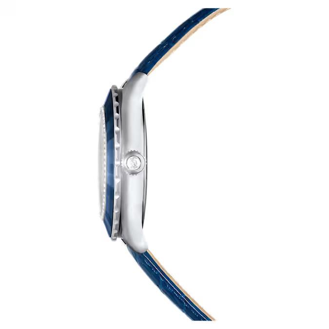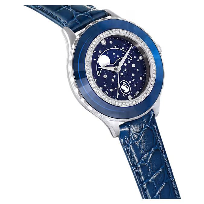 Fabbricato in Svizzera, luna, cinturino in pelle, blu, acciaio inossidabile